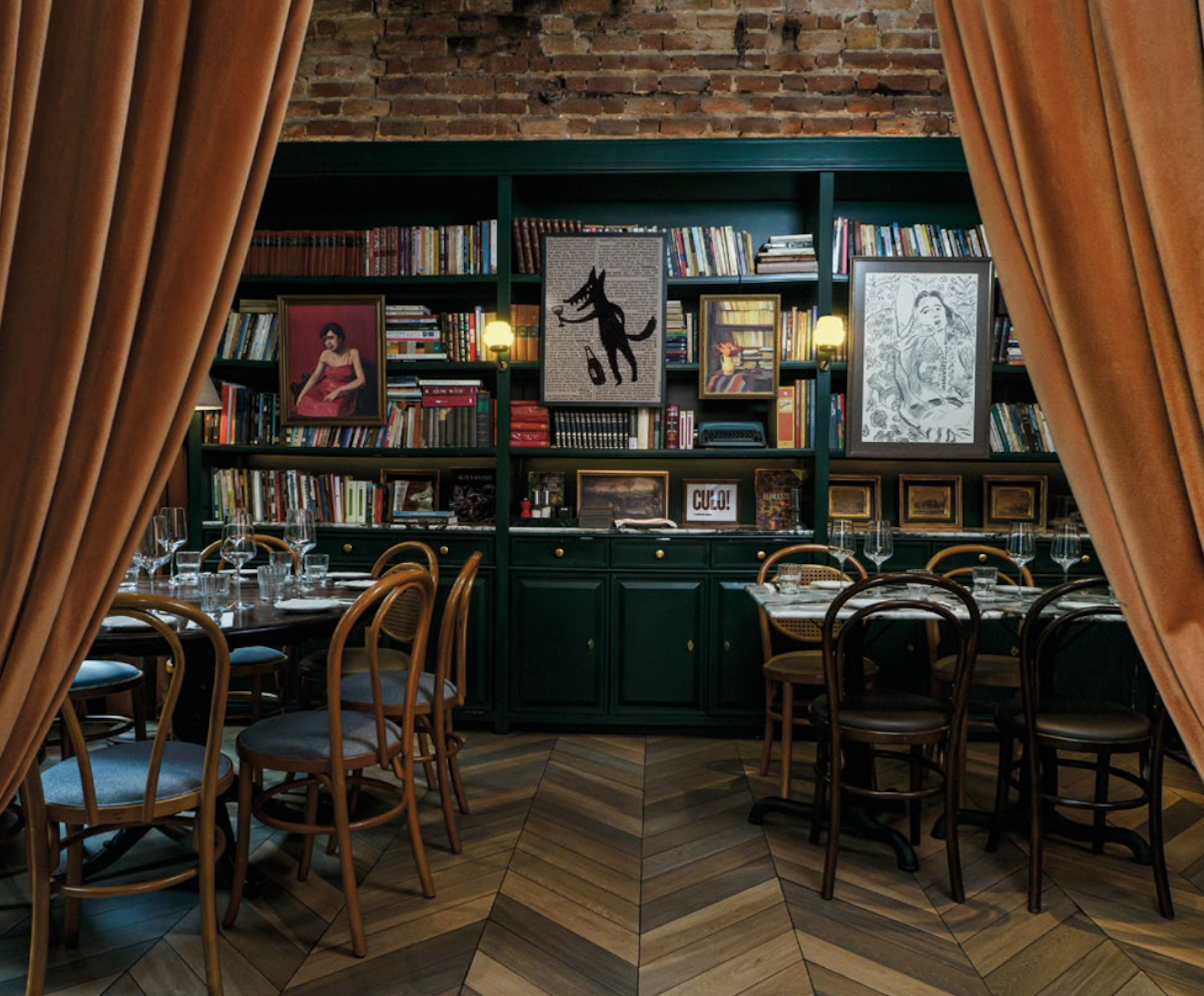 em casas dos anos 1940. Inaugurado primeiro, em 2017, o Grado passou por uma reforma orquestrada pela própria Lara, na qual os cômodos compartimentados foram abertos para dar origem aos salões. “Tive o desafio de coordenar as necessidades de um restaurante com a vontade de preservar ao máximo as características originais da construção”, conta. A massa grossa que cobria a fachada, assim que removida, revelou a textura do tipo “sopapo”, agora totalmente à vista. “A casa foi contando suas histórias e guiando os passos da obra”, diz. Na decoração, destacam-se relíquias de família, como o cartaz de uma ópera de 1915 estrelada pelo bisavô homônimo de Nello, cantor lírico. A estante de madeira através da qual se avista a cozinha é réplica de um móvel que Lara herdou da avó.