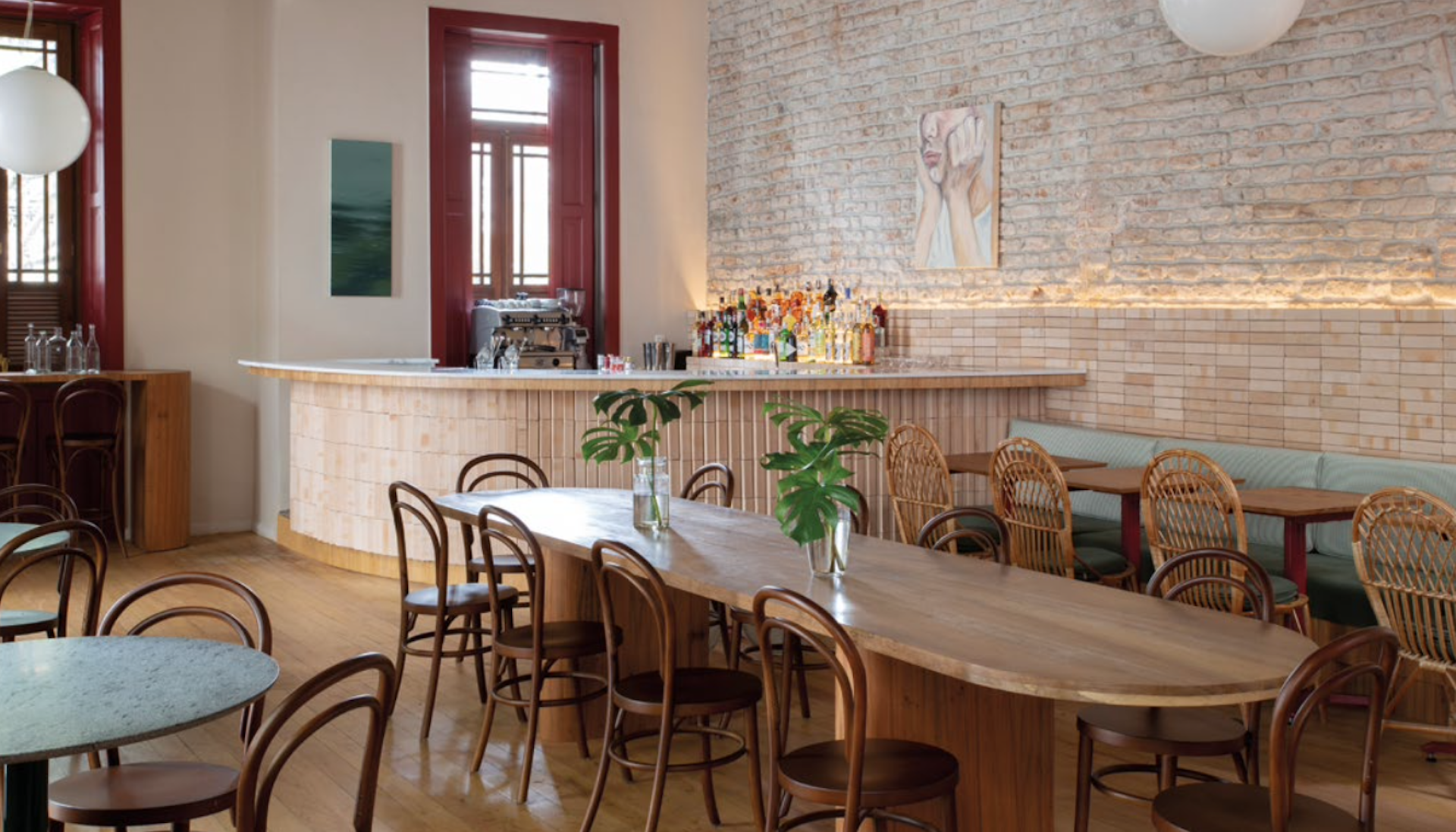 Um casarão tombado no Botafogo abriga o vegetariano Brota. Quando os arquitetos Thiago Tavares e João Duayer, da Tadu Arquitetura, chegaram para criar os interiores do restaurante, o imóvel já havia passado por um cuidadoso restauro, encomendado por inquilinos anteriores. Ali estavam as esquadrias pintadas de vermelho e os tijolos aparentes. Diante do grande salão vazio, a dupla tratou de alinhar o projeto aos desejos da chef Renata Ciasca, parceira de outros trabalhos. “Para ela, era importante ter o bar logo na entrada, pois os drinques são um ponto forte do cardápio”, afirma Thiago. O balcão foi delimitado com tijolos maciços de 9 cm x 20 cm, referência aos materiais originais da casa. No mobiliário, a madeira predomina, acompanhando o tom do piso de tábuas. A extensa mesa central atende a outra solicitação da chef: um espaço no qual os grupos de clientes pudessem se sentar ao lado de desconhecidos, assim como diversos pratos do cardápio são para compartilhar. “Ela tem esse perfil agregador. Buscamos trabalhar com formas orgânicas e cores suaves e naturais para garantir uma atmosfera feminina ao ambiente”, completa Thiago.