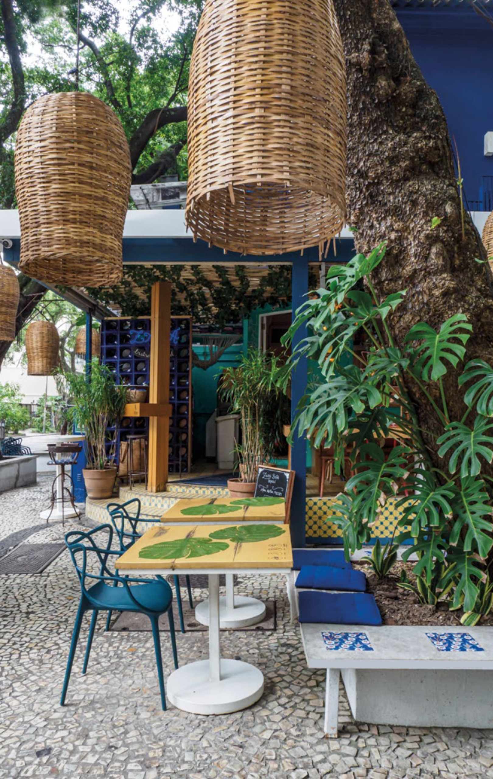 O mais longevo restaurante dessa lista é o Zazá Bistrô Tropical, que ocupa a mesma esquina de Ipanema há 25 anos. “Fiz questão de me instalar numa casa e esperei um ano e meio até aparecer o imóvel certo”, conta a empresária Zazá Piereck, dona do local. Quem hoje passa por lá pode imaginar que as janelas brancas do sobrado, com apliques de vitral, são originais da construção, mas na verdade elas foram encontradas por Zazá num depósito de materiais de segunda mão, antes da inauguração do bistrô, e substituíram as feias esquadrias de alumínio que havia na fachada. A última grande reforma aconteceu para a reabertura da casa após o período de isolamento social. “Fechamos no início da pandemia, em março de 2020, e só voltamos a funcionar em janeiro de 2021”, explica a empresária. No retorno, o restaurante ganhou interiores mais claros e arejados, mesas na calçada e um balcão de onde é possível almoçar observando o movimento da rua. O Jardim Majorelle, em Marrocos, inspirou o azul da fachada, complementado pelo turquesa da varanda. Da cozinha, comandada pelo chef Arthur Cardoso, saem pratos como atum selado em crosta de limão-siciliano e curry de frango orgânico. “Meu maior prazer é cuidar da experiência que vai além da comida: a decoração, a música, as frases na parede, o abraço”, conta Zazá. “Os clientes dizem que se sentem em casa aqui.”