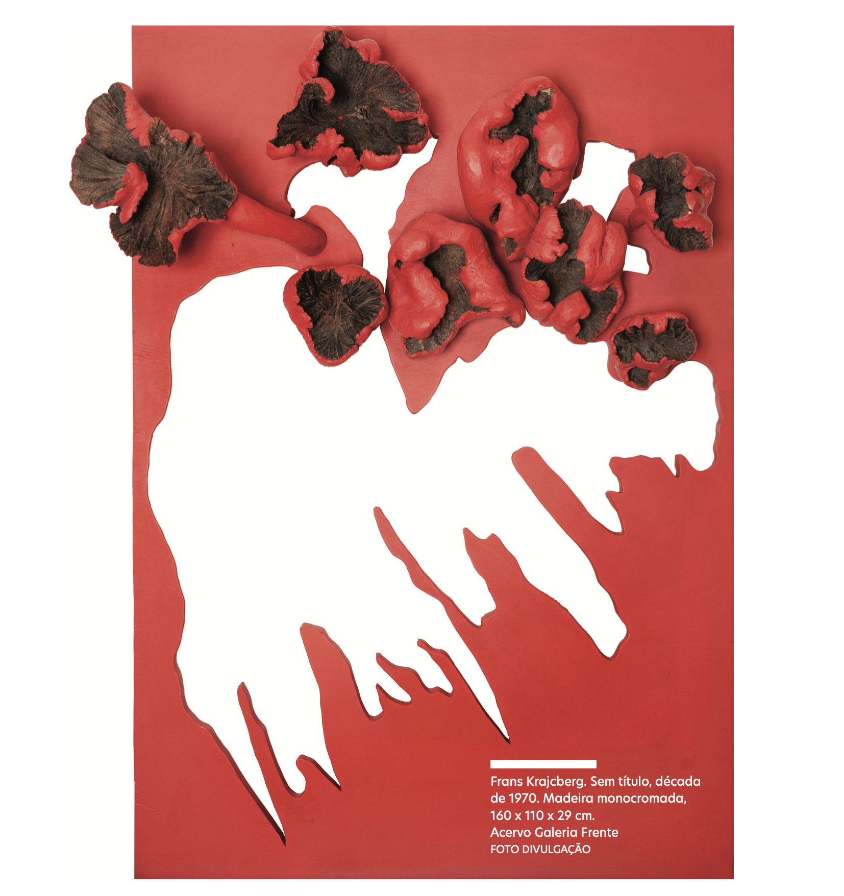 De volta ao Brasil, Krajcberg fixou-se em Itabira, Minas Gerais: “O que fascinava Frans no cenário mineiro era a devastação”, escreveu seu biógrafo. Do solo rachado pela mineração, extraía pigmentos; transformava em matéria-prima as plantas que se contorciam, atormentadas pela toxicidade do ambiente. Mais tarde, estabeleceu-se em Nova Viçosa, Bahia, e, no trânsito entre os dois estados e o restante do país, deu nova função aos resíduos vegetais em sua produção. As raízes semi-apodrecidas do manguezal, as flores de madeira deformadas pela ação de parasitas, os troncos calcinados por queimadas – esses fragmentos, arrancados de ciclos vitais interrompidos, deixaram de ser  suporte e tornaram-se corpo da obra. Consolidaram-se como os ícones mais expressivosde sua linguagem artística.