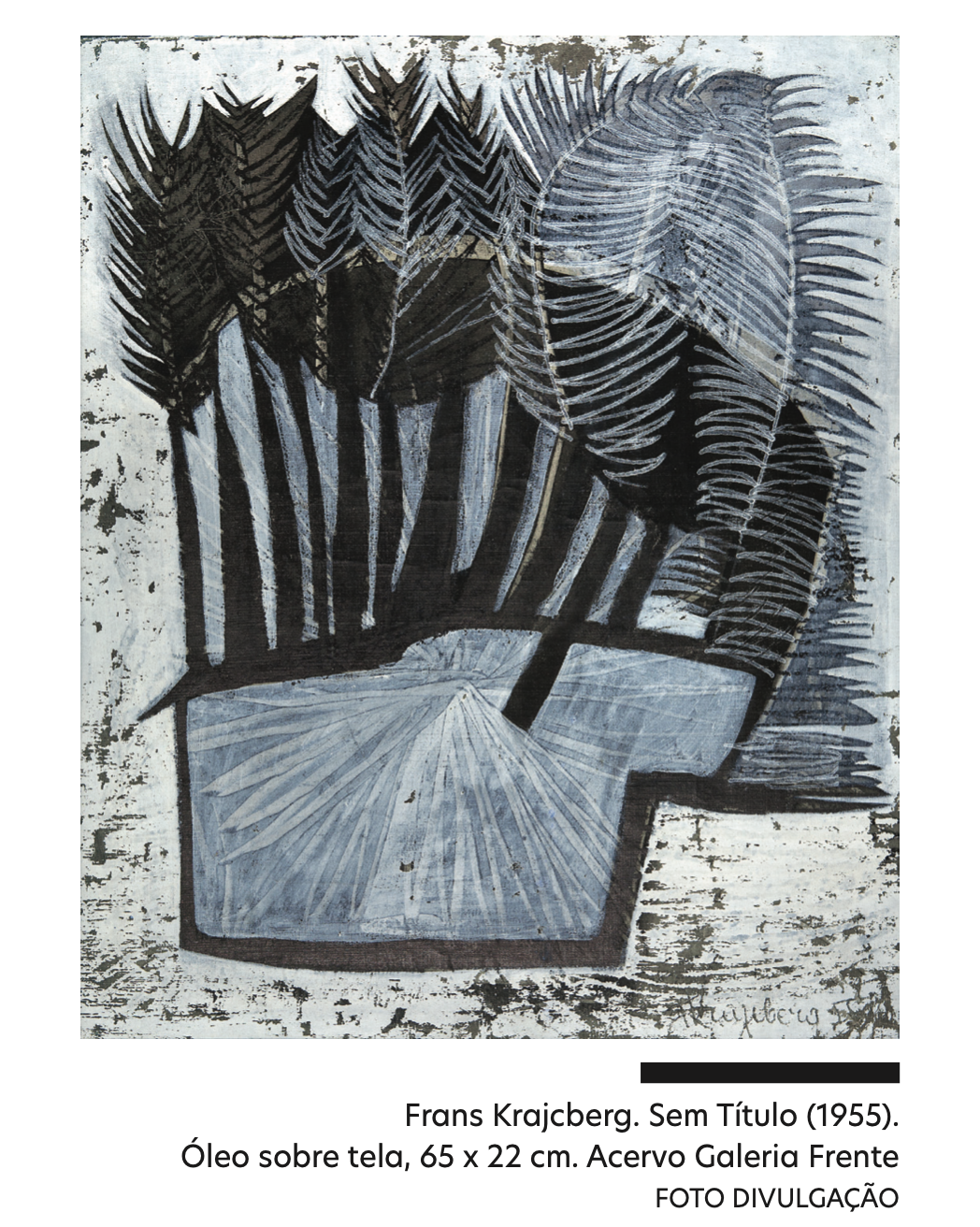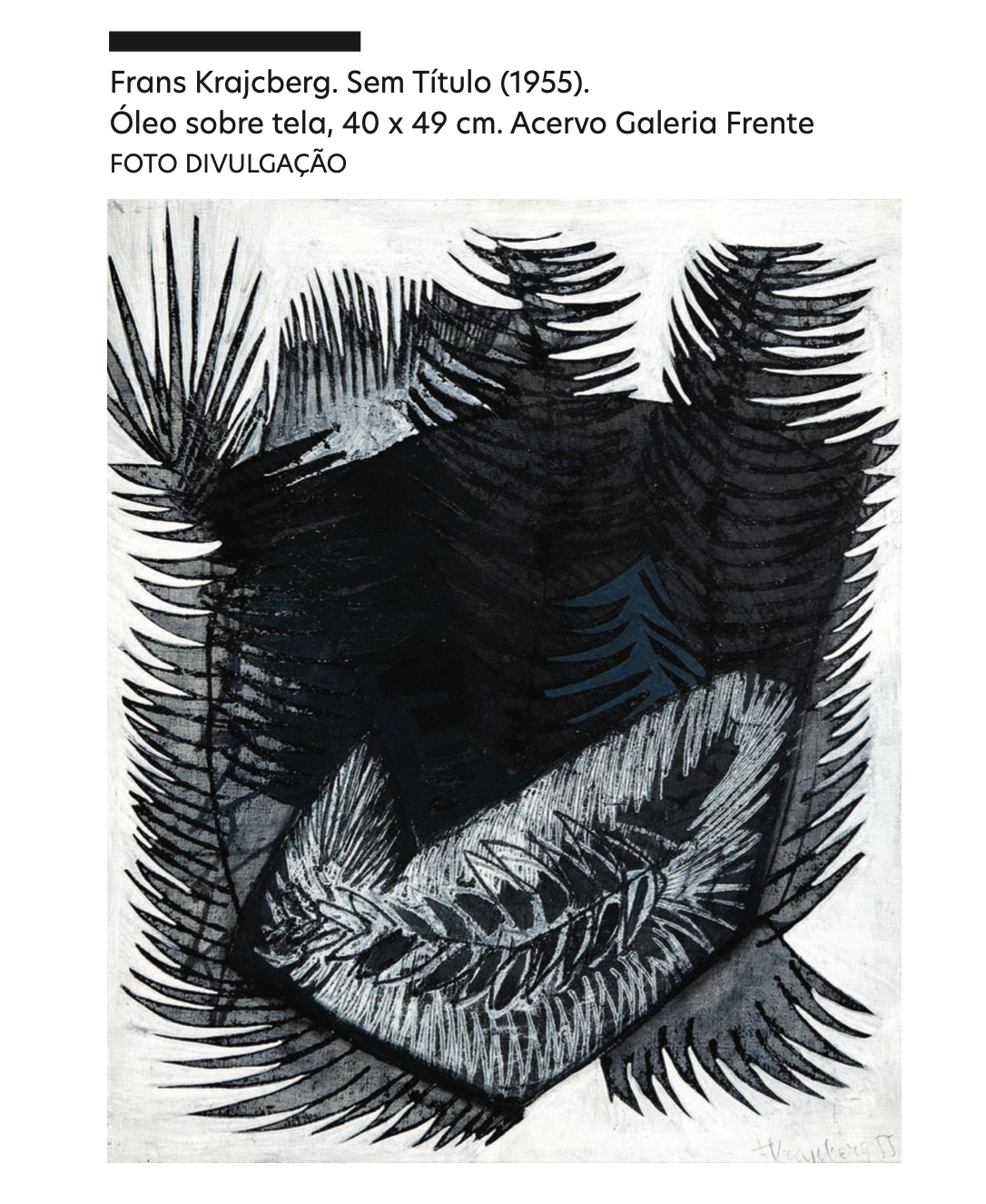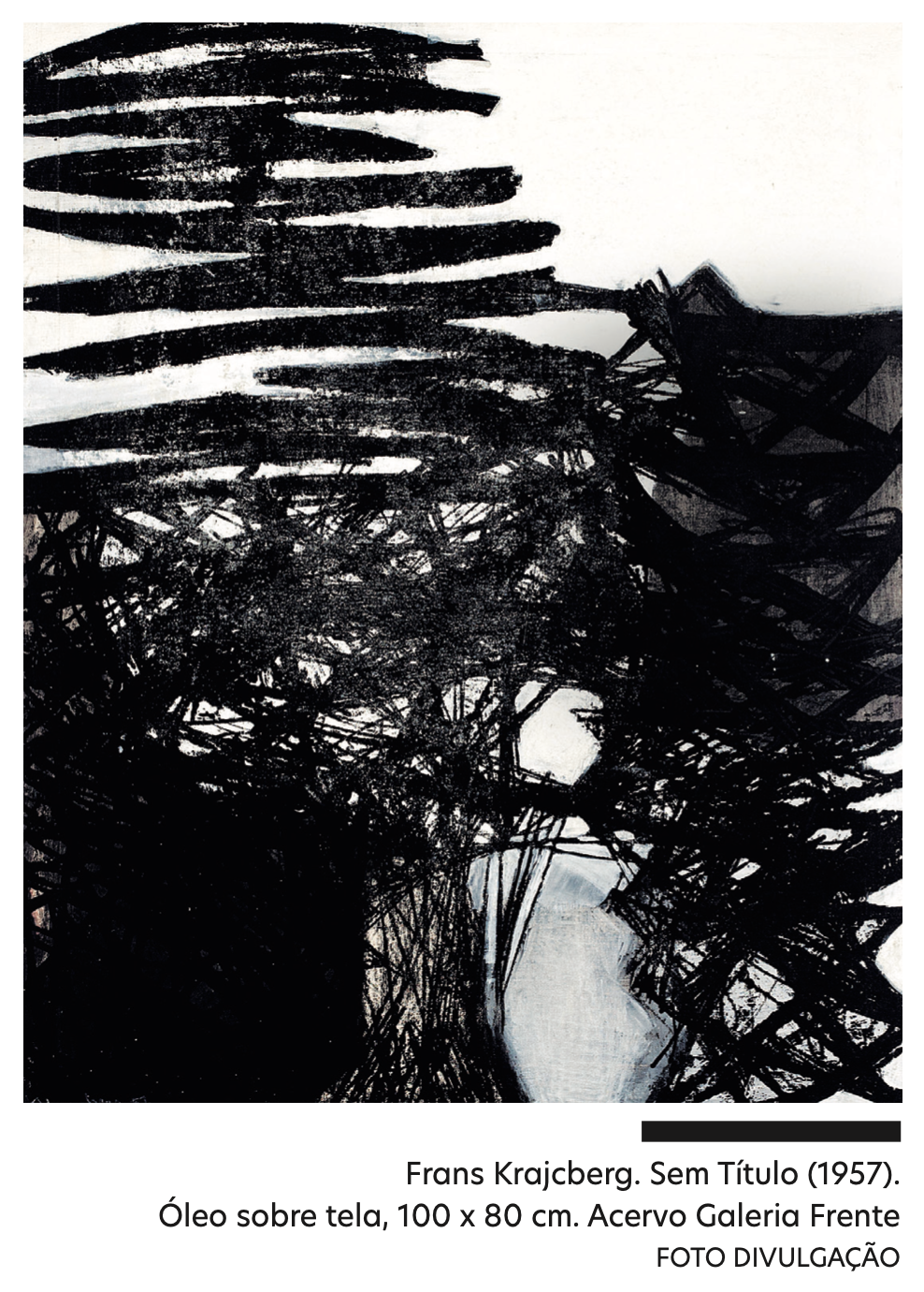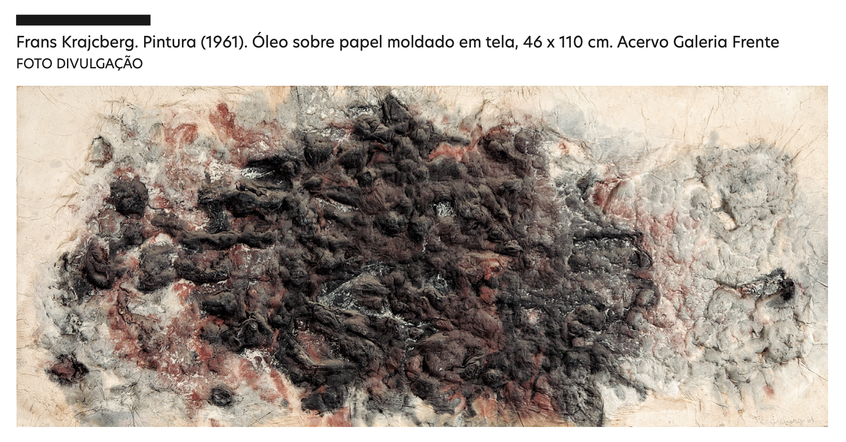 Diferentemente das obras de seus colegas, as de Krajcberg eram dramáticas, corrosivas. O branco fosco se destacava, contaminado pelo preto, produzindo a sensação de que o observador estaria diante de fósseis – testemunhas de uma vida calcificada, que já não existe mais. Uma vida que poderia ser vegetal, mas que também era a do próprio artista, o qual um dia marcou a tela com gestos aventurosos, deixando nela os rastros de sua tensão, decisão e raiva. Em um país que olhava ansioso para o futuro, o polonêsexpunha o peso do passado e as cicatrizes que a modernidade deixava pelo caminho.