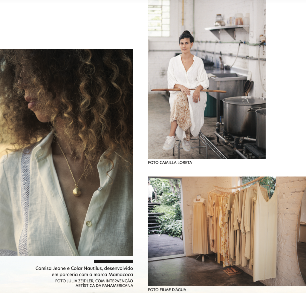 O cuidado é uma característica da marca. Está presente na modelagem das peças, sempre confortável e precisa, com linhas básicas e uma feminilidade atemporal. Apresenta-se, igualmente, na seleção e no tratamento da matéria-prima: linho, seda e algodão orgânico que ganham cores e estampas graças a pigmentos extraídos, por exemplo, de raízes e cascas de árvores. E, como já se pode imaginar, o cuidado alcança os fornecedores e trabalhadores da empresa, gerando impacto social positivo por meio da moda.