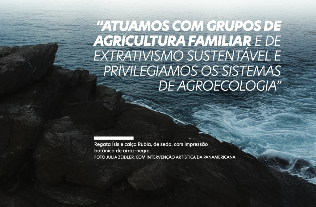 Uma das preocupações que orientam o negócio é o zelo pelos valores morais e éticos. “Temos parceria com cooperativas em todos os biomas do Brasil. Atuamos com grupos de agricultura familiar e de extrativismo sustentável e privilegiamos os sistemas de agroecologia”, conta a empresária. O trabalho com a Rede Borborema de Agroecologia para o desenvolvimento de algodão agroecológico plantado na Paraíba serve de referência para outras iniciativas.