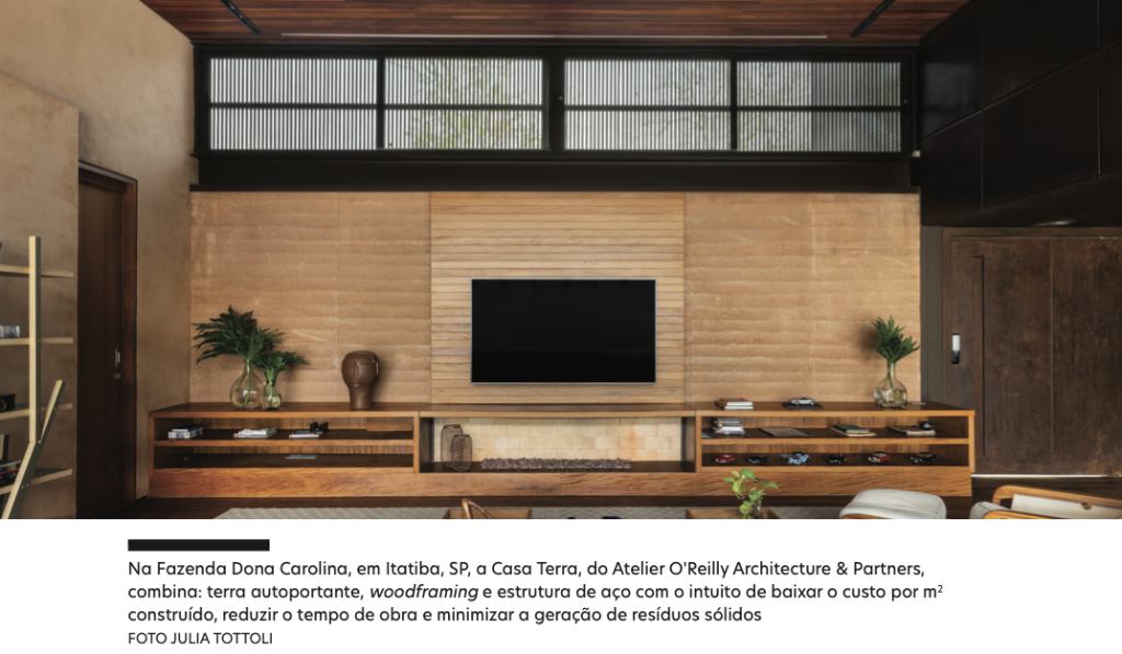Pode-se dizer que é o que acontece com a Casa Terra, que deu ao Atelier O’Reilly o primeiro lugar no 5º Prêmio Saint-Gobain de Arquitetura, na categoria residencial, em 2018. Do planejamento da arquitetura à manutenção da construção e ao seu eventual desmonte no futuro, o projeto erguido em Itatiba, no interior paulista, incluiu premissas sustentáveis em todas as etapas, “criando um sistema fechado no qual nada se perde”, explica a arquiteta Patricia O’Reilly, fundadora do escritório. A execução surpreende pela combinação de três sistemas construtivos – wood frame, aço e paredes autoportantes de terra –, o que não apenas reduziu o custo do metro quadrado construído, o tempo de obra e a geração de resíduos, mas também trouxe ganhos no controle da umidade interna e na eficiência térmica e acústica da casa.